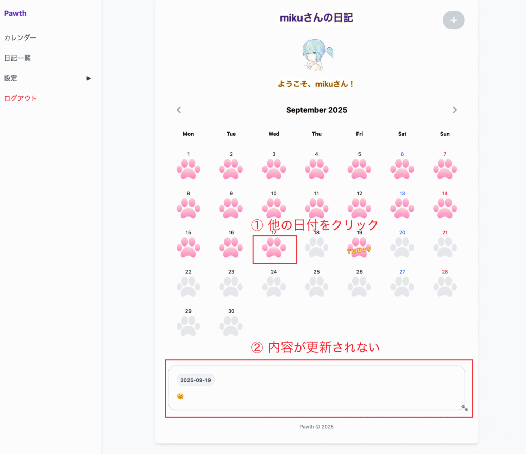 カレンダー画面で日記を新規投稿したあと、別の日付をクリックしても、その日の投稿内容が表示されない。
