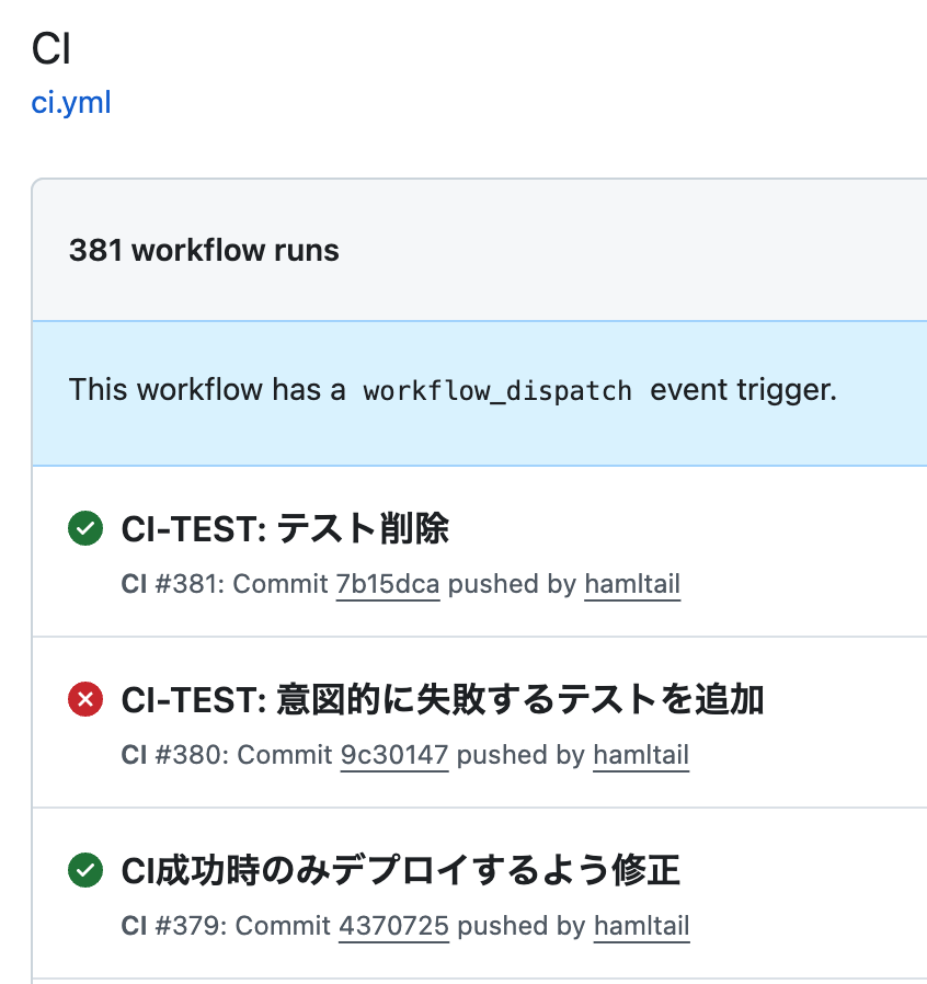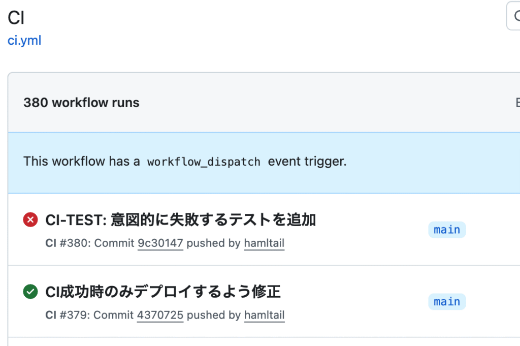 これで「CI が失敗した場合にデプロイされない」ことを確認できました。